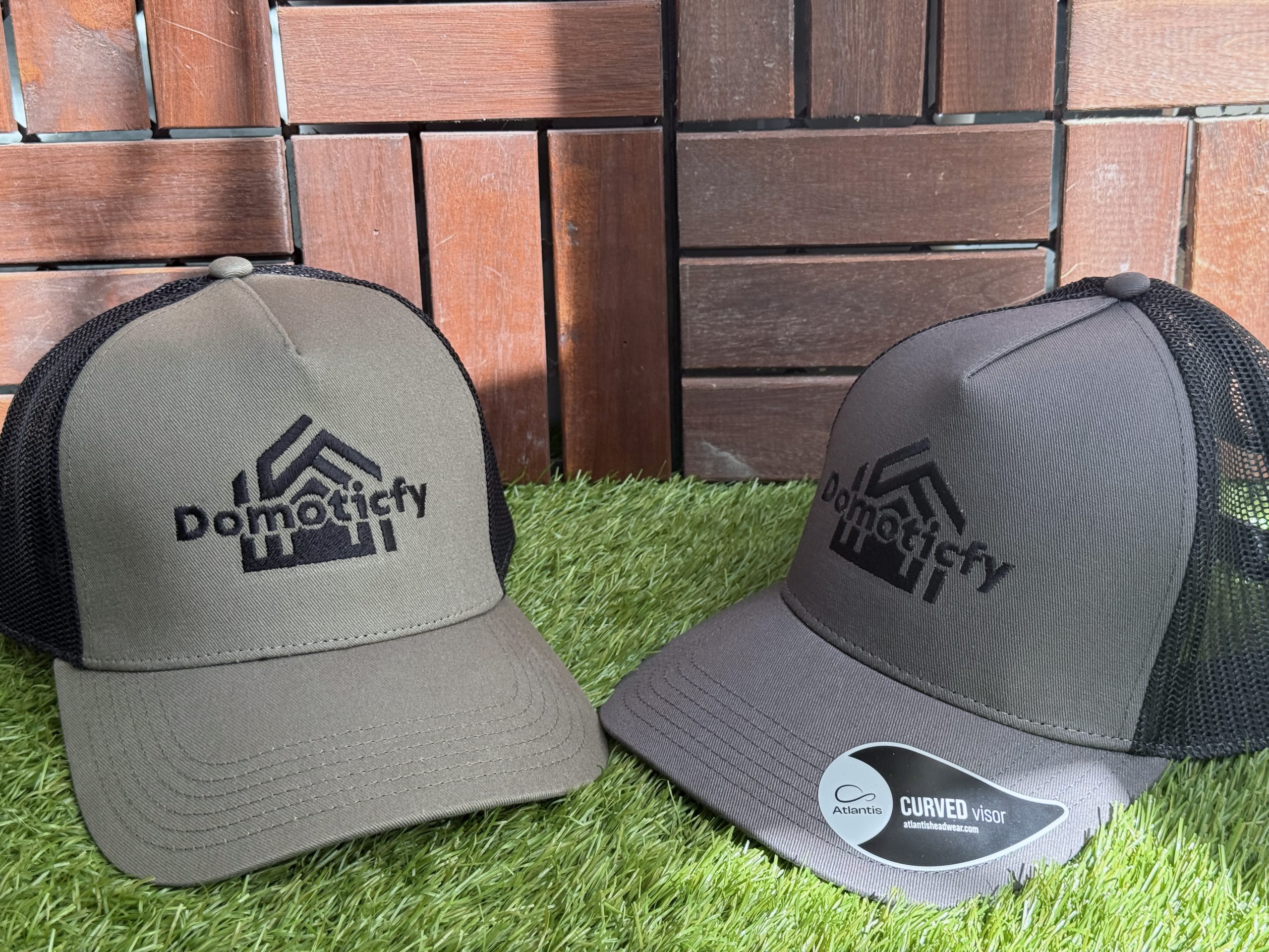 Gorra trucker de estilo urbano con logo de Domoticfy bordado, cómoda, ligera y transpirable, disponible en verde o gris.